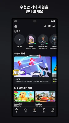 상상하는 모든 것이 현실이 되는 무한한 디지털 세계, Roblox에 오신 것을 환영합니다. 이곳에서는 끝없이 펼쳐지는 모험을 탐험하고, 나만의 이야기를 만들며, 친구들과 함께 특별한 순간을 공유할 수 있습니다. 매일 전 세계 수많은 크리에이터들이 혁신적인 아이디어로 새로운 체험을 추가하며, 여러분이 경험할 수 있는 가능성은 언제나 확장됩니다. 짜릿한 경쟁부터 평화로운 롤플레잉, 창의적인 건설까지, Roblox는 모든 취향과 연령대의 사용자에게 몰입감 넘치는 경험을 선사합니다.