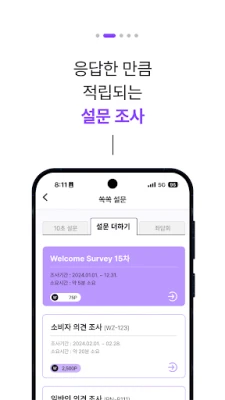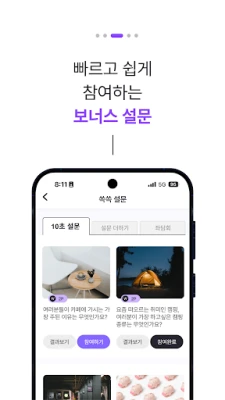 개개인의 관심사와 라이프스타일에 맞춰 제공되는 '나만의 설문'은 더욱 의미 있고 흥미로운 참여 경험을 제공합니다. 불필요한 설문에 시간을 낭비할 필요 없이, 오직 여러분과 관련된 주제에 집중하여 깊이 있는 의견을 제시하고 더 높은 만족감과 보상을 얻을 수 있습니다. 또한, 이 특별한 경험을 주변 친구들에게도 공유하고 함께 혜택을 누려보세요. 추천인 제도를 통해 새로운 친구를 초대할 때마다 푸짐한 보너스 포인트를 받을 수 있습니다. 서로 추천하고 함께 성장하며 더 큰 가치를 창출하는 스마트한 방법을 제시합니다. 지금 바로 참여하여, 여러분의 일상에 풍요로움을 더하고 현명한 소비 생활을 위한 기반을 마련해보세요.